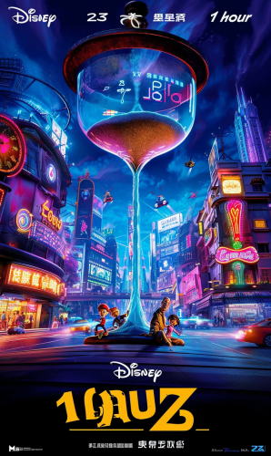 a poster for a disney Pixar animation film called "1 hour 23 minutes", it's the story of a group of diverse friends with a magical hourglass, bright colorful futuristic cityscape background, typography includes the credits and production company at bottom --ar 3:5 --v 6.0