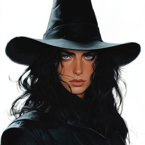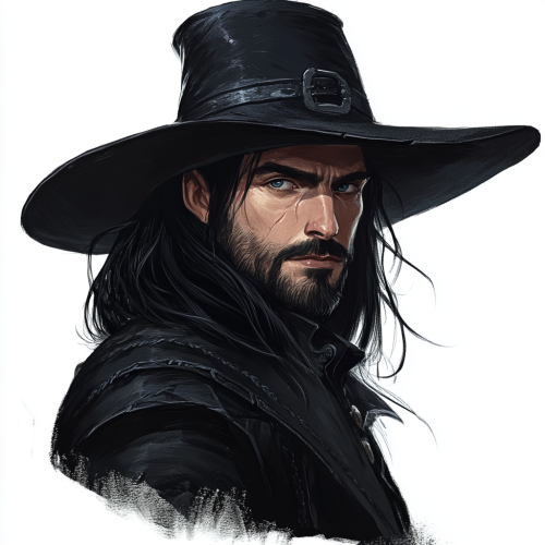 D&D character art. Human rogue. Wide brimmed puritan witch hunter hat. Black clothing. Well groomed black hair. Blue eyes. In the style of Larry Elmore.