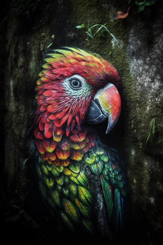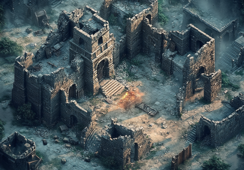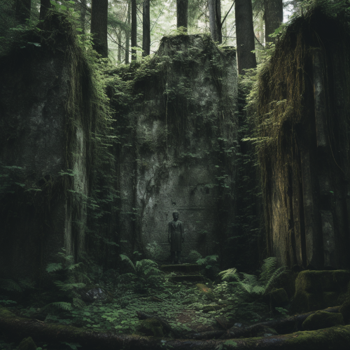 forest, crumbling concrete wall, dark, overgrown, slender stone figure in the shadows --v 5.2