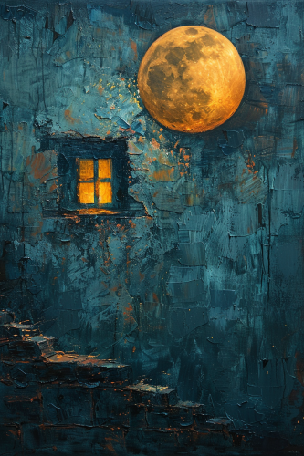 acrylic painting, dreamy, surreal, big moon behind a stone euro wall with a small lit window, thick strokes, contrast, --s 600 --ar 2:3 --v 6.0