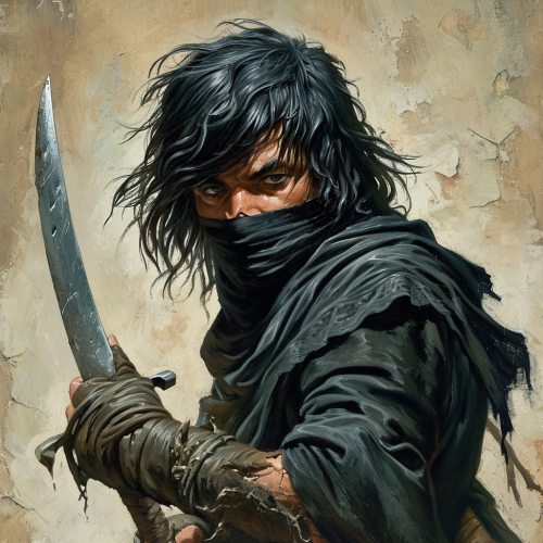 fantasy art. an illustration in the style of Larry Elmore. A badly scarred human bandit wheres a black cloth around his face to protect his identity, he has a shock of unkept black hair. The bandit holds a wicked, curved knife. --v 6.0