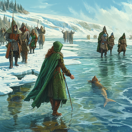 fantasy art. An illustartion in the style of Larry Elmore. A female druid dressed in green walks across a frozen lake to help an injured fisherman. Other fishermen applaud and cheer as she approaches. --v 6.0