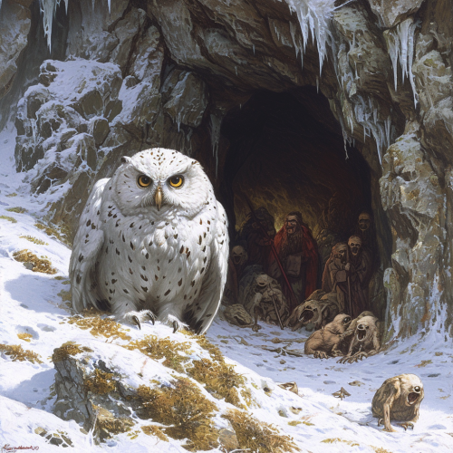 fantasy art. an illustration in the style of Larry Elmore. An owlbear lurks in a cave entrance. There is snow around the entrance to the cave and several dead humans behind it. --v 6.0