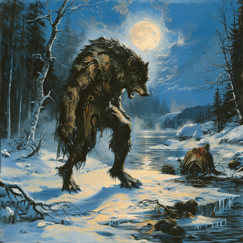 fantasy art. An illustartion in the style of Larry Elmore. A werewolf howls at the moon. It wears tatters of clothes. It stands on a frozen lake and a dead villager is at his feet. --v 6.0
