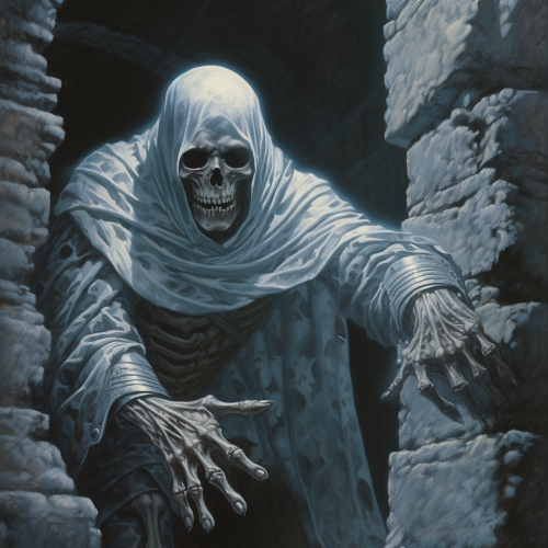 ghost of a knight, reaching foward towards the camera, passing through a stone wall, dark, in the style of larry elmore