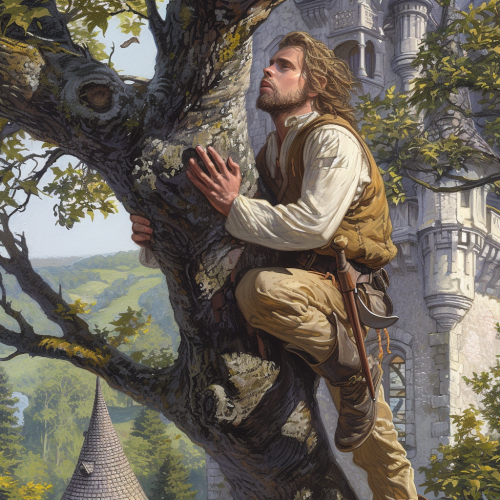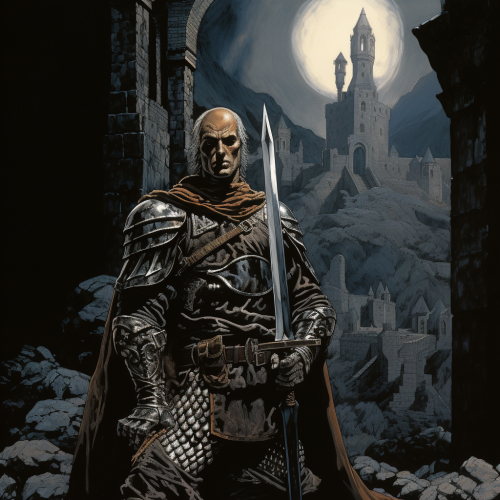 pale frankish knight, dressed in rusty armor and a tattered tabard, holding a sword in castle ruins, in the style of Larry Elmore, dark lighting, moonlight --v 5.2