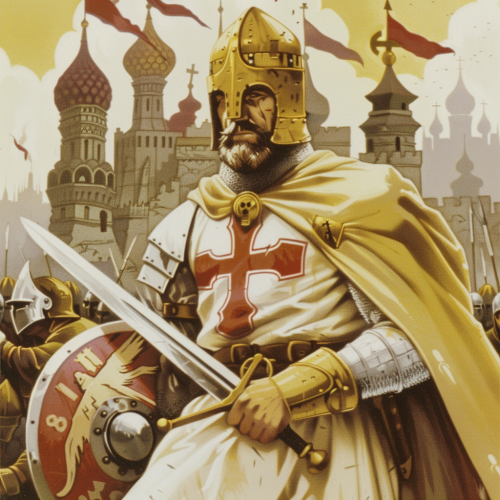 A front shot of a crusader with a sword in both hands and backgorund is collapsed church with other troops--ar 2:3 --stylize 750 --weird 500 --chaos 50 --style raw