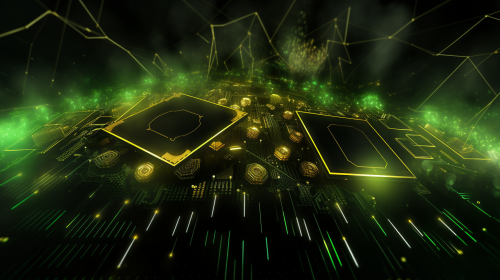 12k ultra hd background, black background with electricity of green and gold, elements of crypto currency --ar 16:9