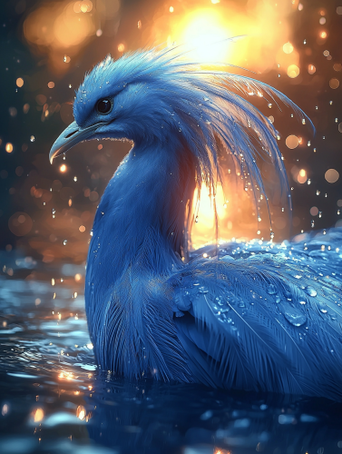 a super realistic blue beautiful pure phoenix rising out of a clean blue cristal water river, a golden sun and sunrise over the phoenix feathers, water drops over the phoenix, --v 6.1 --ar 3:4 --q 2 --stylize 1000
