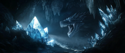 dark blue crystal on spotlight in dark place, behind crystal is big dragon head lookin on camera. Dragon is hidden in the shadows, big natural, wide 21:9, hd