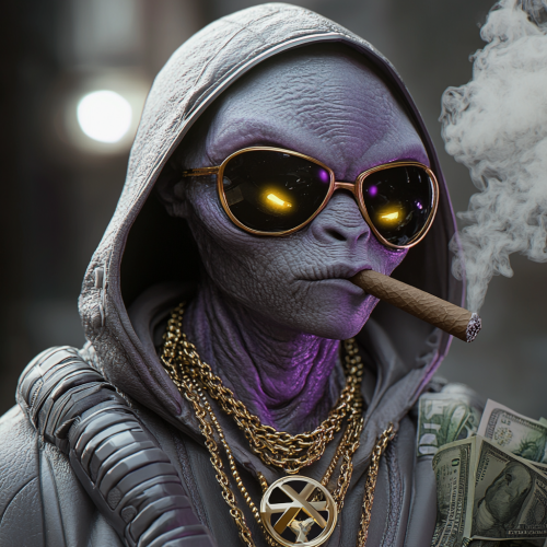 grey alien with purple tint and yellow eyes in high tech body armor with X symbol on chest wearing a hooded jacket and sunglasses and gold bling necklaces with smoking cigar in mouth holding dollars, hyper-realistic