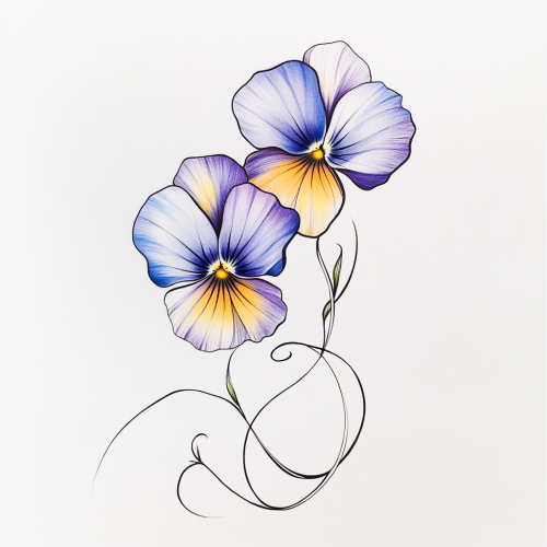 A simple line drawing of two small blue purple and yellow pansy flowers with delicate petals, intertwined in an elegant and graceful manner on the right side of the page. The design includes curved lines to create movement or flow around them. It is drawn against a white background . This tattoo sketch symbolizes beauty, elegance, love, harmony, serenity, romance, natural elements like nature, floral motifs, and feminine features. It is isolated on a white background with a black outline on a pure white background. The image is high resolution. The flowers are painted in an abstract style