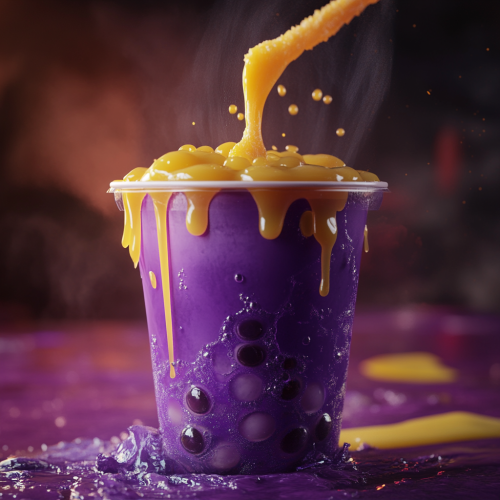 a purple bubble tea (with a steraw), in which a yellow transparent liquid is being slowly poured and dripped. Photorealistic. 4K. The scene has a quite dramatic ambiance. and low lights