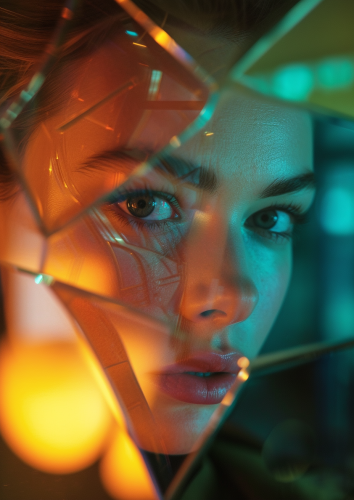inspired by pablo picasso's cubism, photograph of margot robbie in a fragmented way. use mirrors or reflections to break the image into cubist-like shapes, creating an abstract, multi-perspective view, shot with hasselblad --ar 5:7 --v 6.0