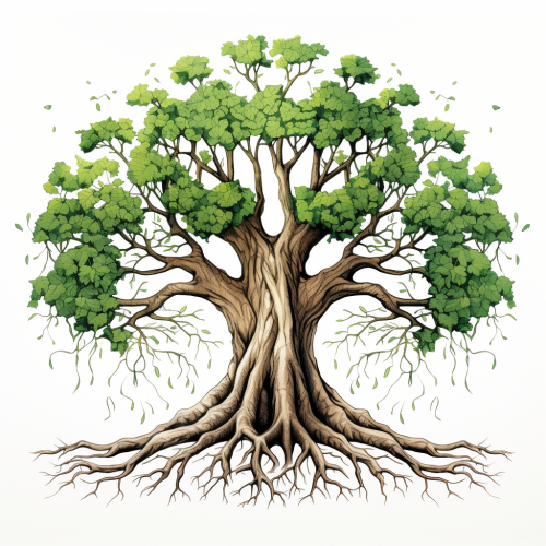 Cubistic illustration of big tree made of triangels with a big root system. White background. Style of Tove Janson.