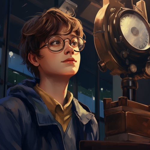 highschool student standing behind a coin-operated binocular. the view shows the student form the front. face not visible behind the binocular.