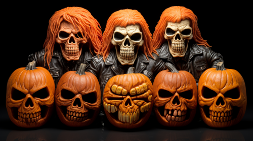 a garage decorated for Halloween, featuring a Halloween pumpkin wall décor product mockup; the carved eyes and mouth of the pumpkin hold mirrors that reflect the stylish space; hyper-realistic image; captured with a Leica SL2-S, 35mm lens; --ar 3:2 --s 250 --v 5.0