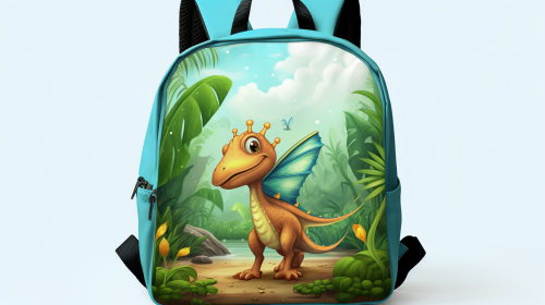 a small and curious dinosaur carrying his backpack marveled at the colossal leaves, fairy tale, cartoon style, size 16:9, --ar 16:9
