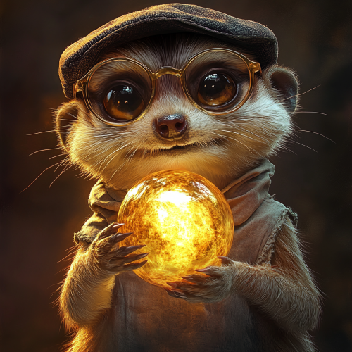 A hungry middle-aged humanoid meerkat wearing glasses and a cap, snapping up the Palantir, which is a magical orb from the movie The Lord of the Rings. realism