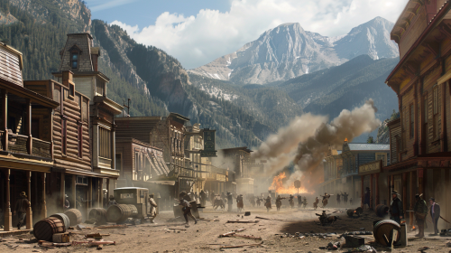 1800's mountain town, main street, dust, splintering wood, active firefight between heroes and evil gunslingers, illustration, high-resolution --ar 16:9