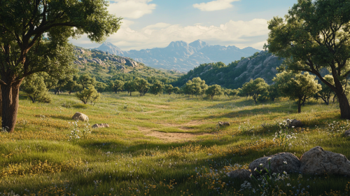 green grass and brown dirt, overgrown trees, muted, western wilderness with different types of grass, rocky, muted blue sky, and small mountains in the background, --ar 16:9