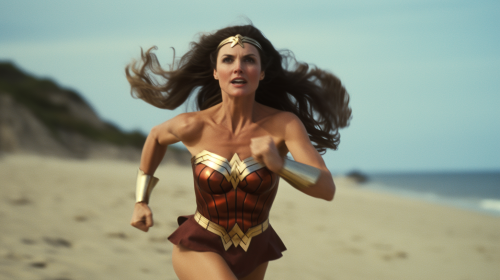 Lynda Carter in Seventies Wonder Woman costume running on a beach, 70mm, serious expression, in pursuit, --ar 16:9 --v 5.1