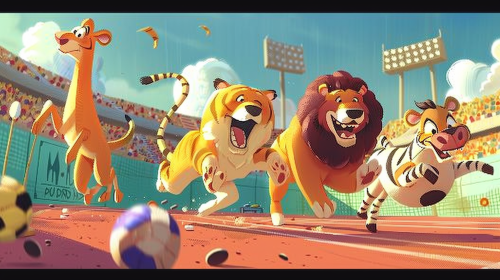 A playful cartoon scene of a dog, a tiger, a lion, an octopus, and a horse exercising in a stadium. The animals are drawn in a fun, exaggerated cartoon style, each doing different exercises. The dog is running, the tiger is stretching, the lion is lifting weights, the octopus is using its tentacles to juggle balls, and the horse is jumping hurdles. The stadium is colorful and full of energy, with bright, vibrant colors and a fun, whimsical atmosphere. --ar 16:9 --stylize 150 --v 6.0