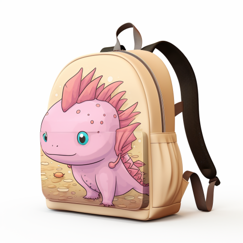 side view cute cartoon pink axolotl with head gills , carrying brown backpack, travel, children book, cartoon --v 5.2