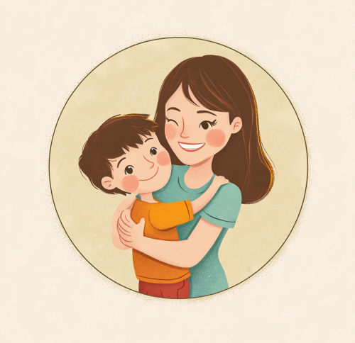 A cute cartoon mother and son , with the child holding his arms around mom's waist while smiling happily at each other. The circle has an illustrated border and is set against a light brown background. It features soft colors and simple lines to capture its adorable essence in a minimalistic children's book art style. --ar 41:40