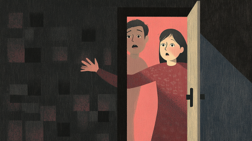 mom and dad waking up at night because they hear their baby cry in the room next door, they are shocked and worried, they rush outside their bedroom, the door is open, --sref 1937454777 --ar 16:9 --v 6.1