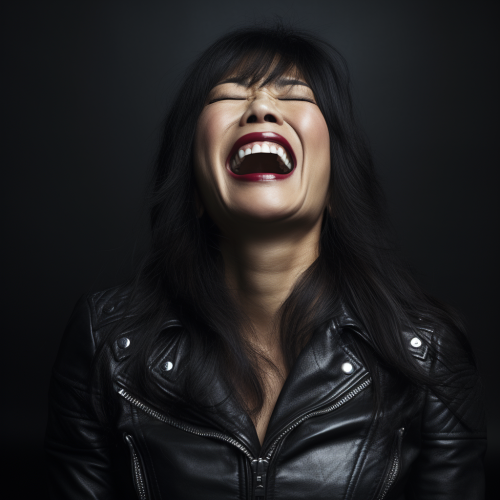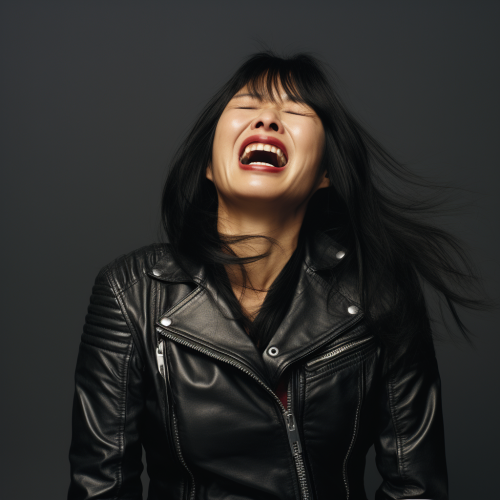 **middle aged Asian mom with black flat bangs straight long hair, eyes closed and mouth open, peacefully, little sad, lifelessly, in tight leather, inspected by two laughing open eyes women