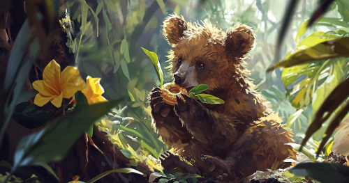 a cute baby bear in the hawaiin jungle eating small round puff pastries --ar 4:5