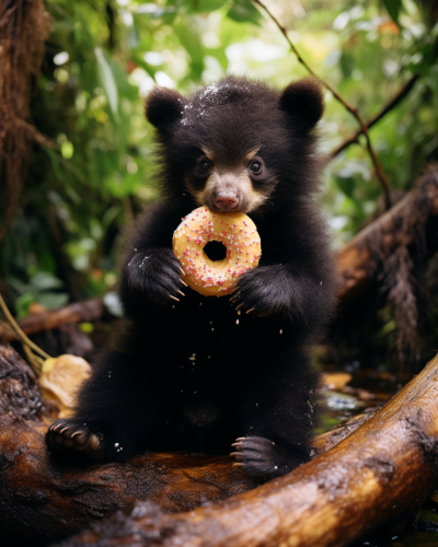 Adorable baby bear enjoying delicious pastries in Kauai jungle