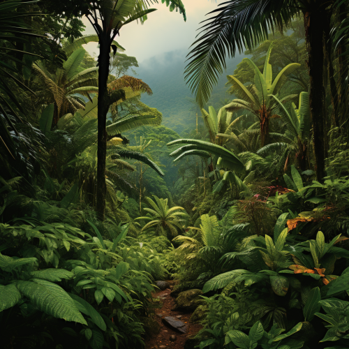 colorful drawing close-up of a baby chimpanzee in a bright, lush jungle setting. The chimpanzee's large, expressive eyes reflect the light of the moon visible in the background sky. Surrounded by lush green foliage and colorful tropical flowers, this scene evokes a magical, peaceful feeling. The leaves of the plants are brightly colored, some turn yellow. The detailed textures on the chimpanzee's fur and living forest make this scene both charming and captivating.
