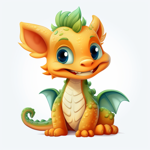 a single, cute, friendly looking, smiling, baby dragon in a cartoon style with a flat white background reserve ample space around character
