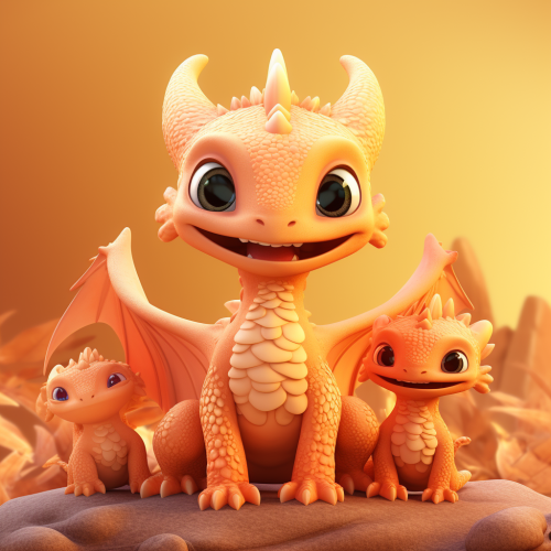 baby dragon, cute, 3d animated, rendered, pastel colors, huge eyes, smiling, magical, with 2 or 3 smaller baby dragons, on a orange monochrome background, a lot of detail