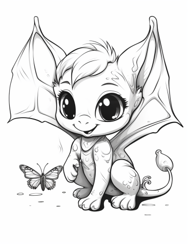 Line art, cute, chibi style, baby dragon learning to fly, for a kids coloring book with clean, crisp lines and white background --ar 17:22 --no color