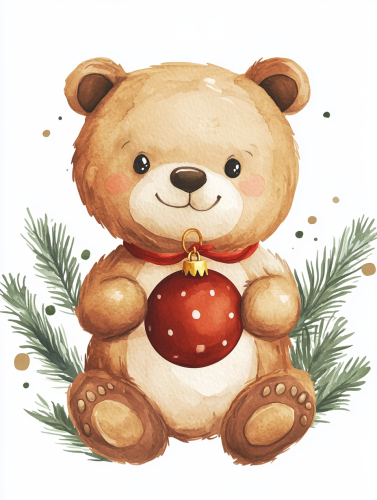 a cute pola bear holding christmas decoration , simple drawing style, white background, earthy watercolor, cartoon illustration, soft colors, minimalism, adorable baby look, vintage poster design, clipart, PNG. --ar 3:4