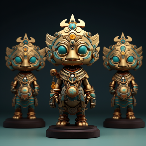 Chinese magic puppet figurines, cute, Sanxingdui blind box, bronze figures, gold masks, cute cartoon characters, high quality, 8K, blind box design, Chinese style, 0C rendering, 3D, stage lights, color matching bronze --v 5.2