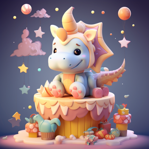 Isometric, cute party scene, blind box style dragon character, clouds, stars, moon,baloons, clay material, low detail geomtry,soft pastel colour, 3d clay render