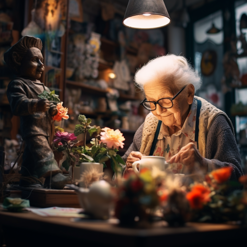 In the coffee shop full of flowers, the grandmother laughed and recalled the romantic past, backlight photography, Blind box toys, 4K, HDR