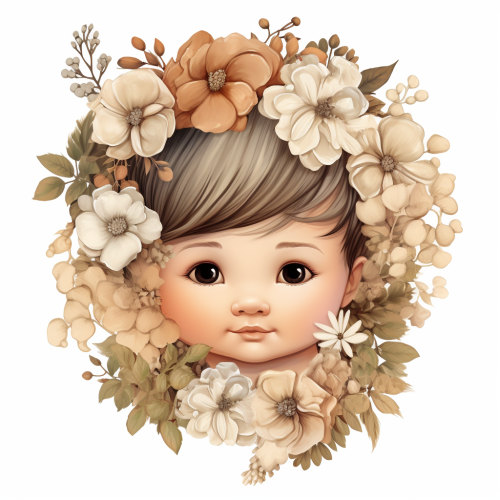a light colored neutral, super cute adorable, majestic, dreamy and cartoonish floral clipart for babies. the colors should be very light brown and rich beige, highly detailed watercolor clipart, isolated with white background.