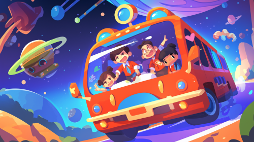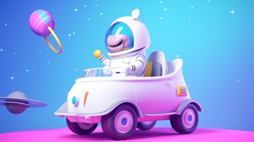 A cartoon-style small car with a cheerful astronaut sitting on top, colorful and whimsical design, bright blue sky in the background, playful and fun atmosphere --v 5.0 --ar 16:9 --s 50