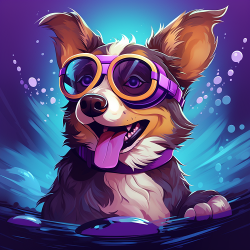 a cartoon realistic vector style Cute Happy Dog wearing swimming goggles, Background color Sharp Purple