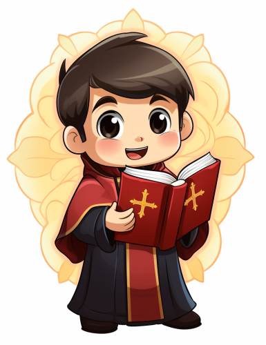 bible characters colored image bible cute character Saint Thomas Aquinas, holding the cross, sanrio style --ar 17:22
