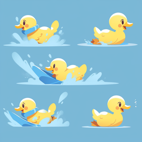 8k ultra hd. CMYK color profile. Print color profile, simplistic Sanrio cartoon drawing inspired, different angles, expressive, storybook drawing, artstation drawing, multiple angles, playful and expressive, cute happy expressions, irresistibly cute and playful adorable ducky playing in water, dynamic pose, expressive, simplistic drawing, comic, full body ducky playing in water with adorable, chibi, happy, round features, cute, dynamic poses, white background --niji 5 --style expressive