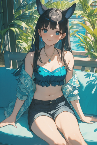 cute attractive neko woman, beach clothes, sat up on sofa, inviting smile, nawr pose, anime cartoon, --niji 6 --ar 4:5