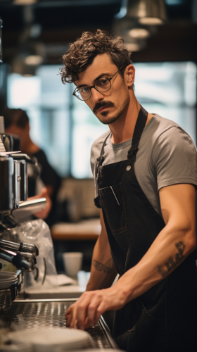 barista focused intently, using precise movements to craft lattes and cappuccinos. --ar 9:16