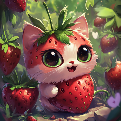 A cute chibi cat with a body resembling a strawberry. The cat’s fur is a vibrant red with green leafy accents on its head, mimicking a strawberry's leaves. It has oversized, expressive eyes and a playful, adorable pose. The background is magical garden filled with oversized strawberries, enhancing the cat’s fruity charm
