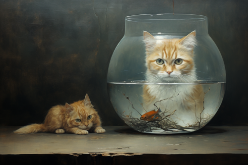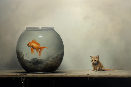 cat and goldfish bowl, dead fish::3 painting, cute, minimalism, watercolor wash, art by paul klee::1 --ar 3:2 --weird 200 --s 200 --no photography